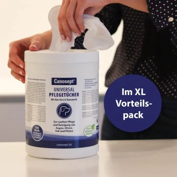 Die Canosept Universal Pflegetücher sind die komfortable Lösung zur sanften Reinigung von empfindlichen Körperstellen Ihres Hundes. Dank der wohltuenden, natürlichen Aloe Veraund Hamamelis-Extrakte werden stark beanspruchte Bereiche an Augen, Ohren, Fell, Pfoten oder im Intimbereich ganz schonend, einfach und gründlich gepflegt und Hautreizungen gelindert. Die besonders weichen und dennoch reißfesten Canosept Universal Pflegetücher sind zu 100% biologisch abbaubar und frei von Mikroplastik. Durch den Verzicht auf störende Duftstoffe, Parabene und Alkohol sind sie auch für empfindliche Hunde ideal geeignet. Der Vorteilspack beinhaltet 160 hochwertige Pflegetücher und schützt diese mit einem praktischen Frischeverschluss vor dem Austrocknen.