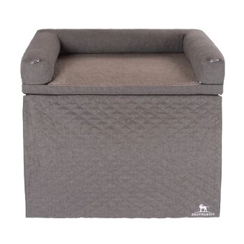 Das Bett Yona bietet eine Liegefläche mit einer vier Zentimeter starken, flexiblen, orthopädischen Füllung. Vor der Liegefläche breitet sich eine großzügige Schondecke aus, die mit einem weichen Plüsch Polyestervlies versteppt wurde. Besonders praktisch ist, dass du die Schondecke durch einen zusätzlichen Reißverschluss abnehmen kannst. So ist sie vielseitig einsetzbar. Aufgerollt kannst du sie mit Knebelknöpfen am Rand des Bettes befestigen und aus dem Hundebett mit offenem Einstieg wird ein geschlossenes Hundebett. Dank Antirutschgewebe auf der Unterseite eignet sich das Bett aber auch hervorragend als Kofferraum- oder Sofaschutz und sie ist, wenn ihr unterwegs seid, das Reisebett deines Knuffels.